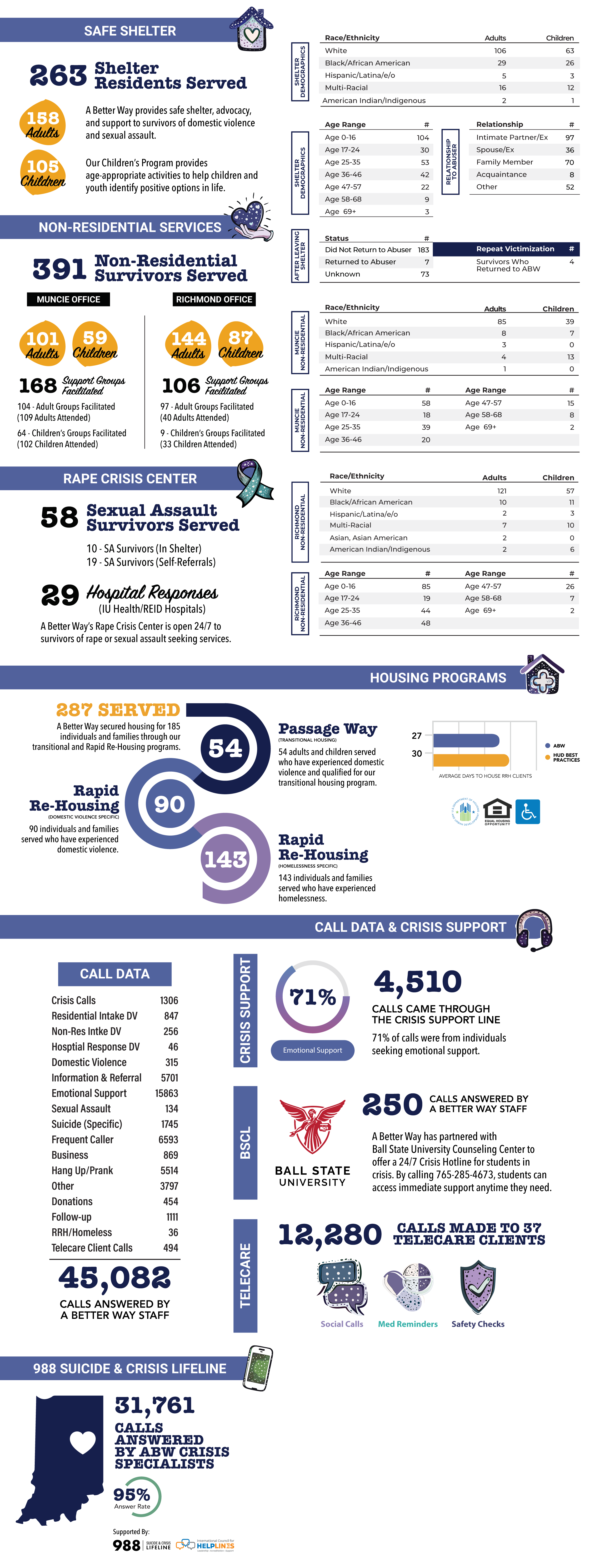 In 2020, A Better Way covered 37 counties in Indiana for the National Suicide Lifeline and adopted chat services in September of that year.